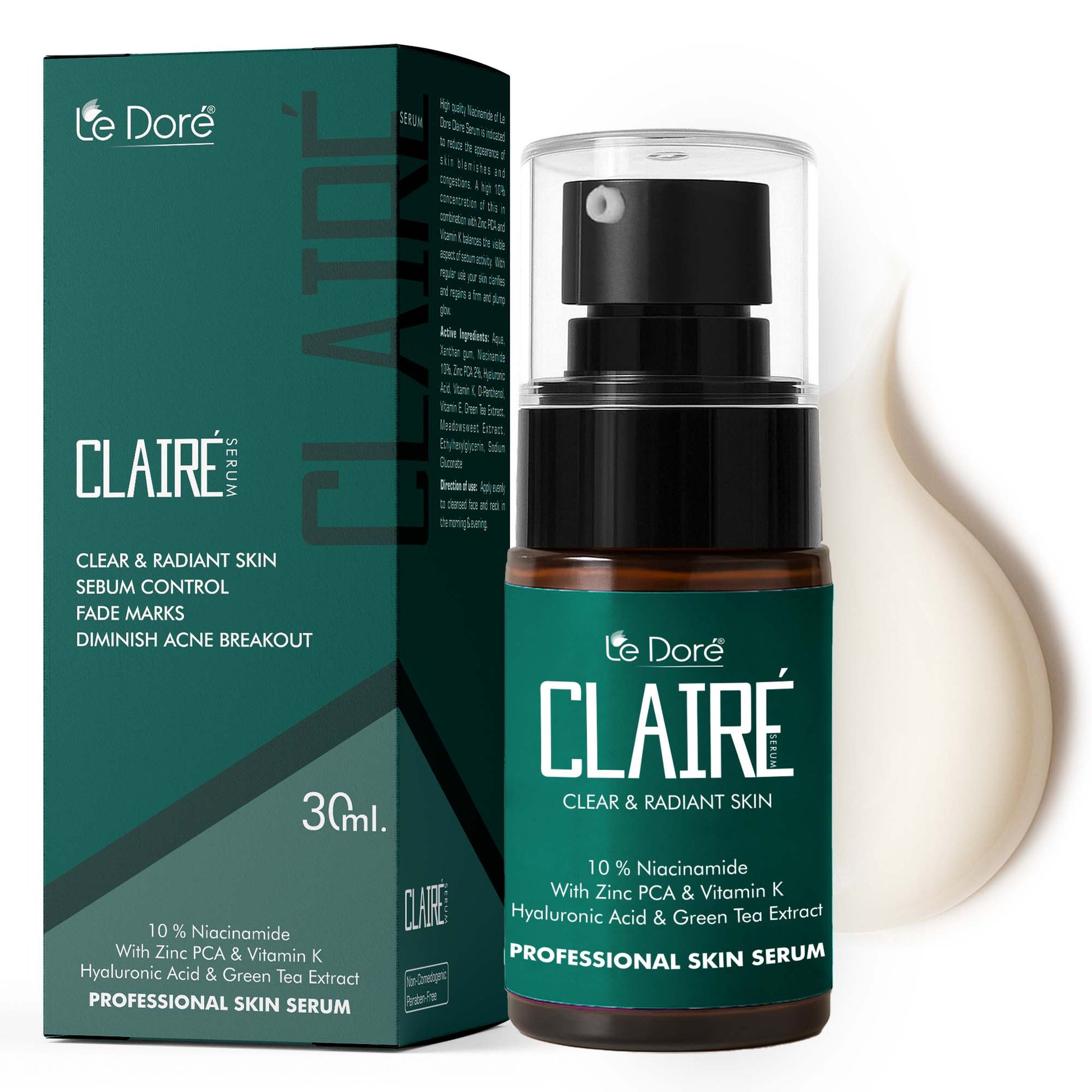 Le Doré Claire Serum is a lightweight, daily treatment designed to refine texture, control excess oil, and promote a visibly clearer complexion. Powered by 10% Niacinamide, Zinc PCA, and Green Tea Extract, it works deep within the skin to restore balance and radiance.