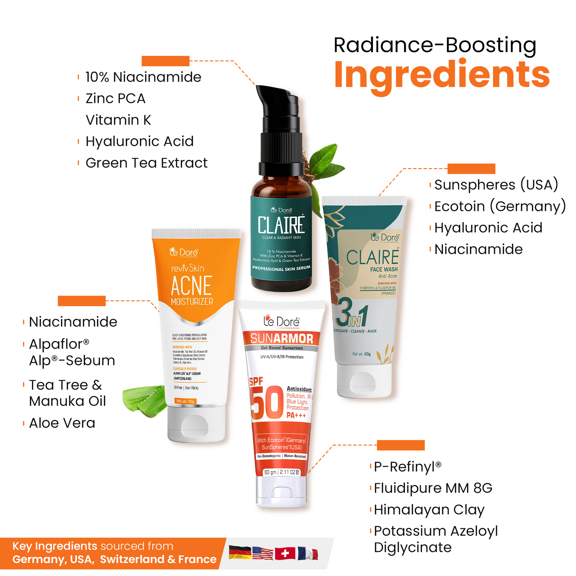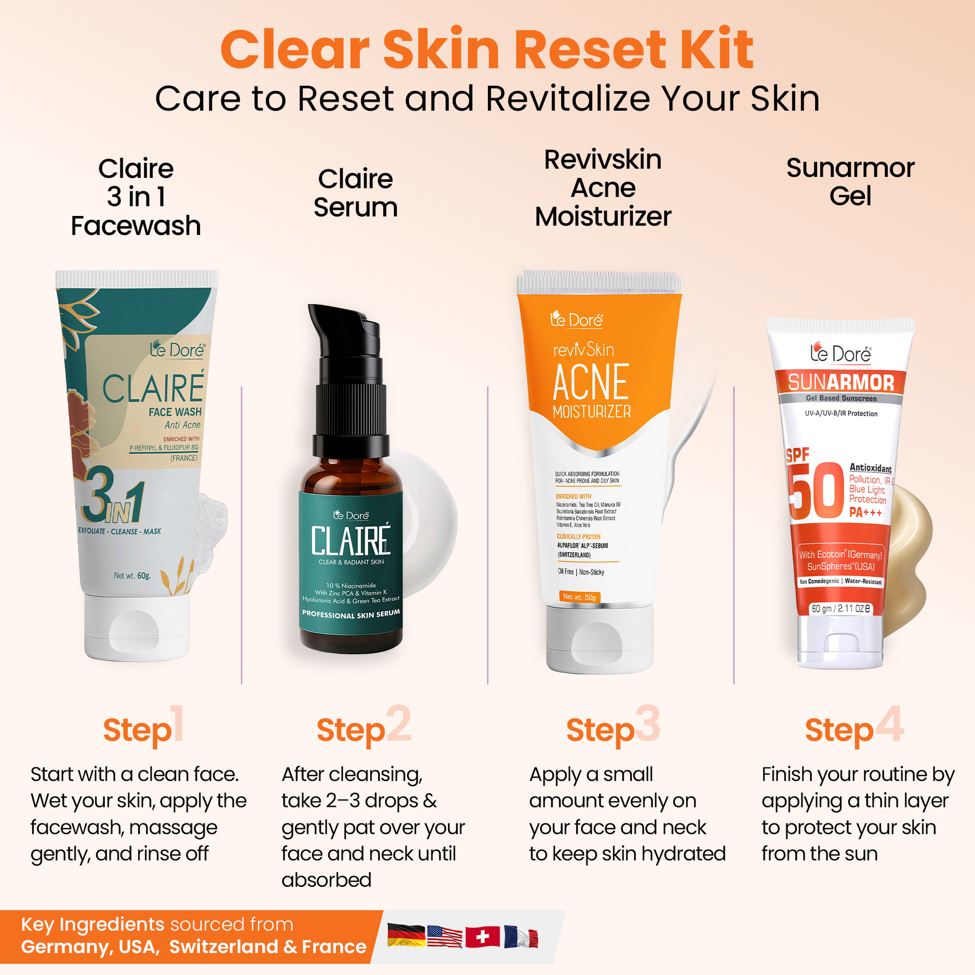 The Le Doré Clear Skin Reset Kit is a targeted, dermatologist-formulated routine built to address acne, oiliness, and post-acne marks from the root.